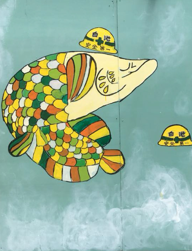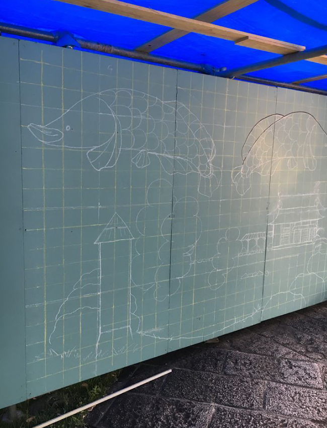 鉄輪の白池地獄さんの工事をしていて、べニア板で工事現場を囲っていますが、そこの壁にせっかくなのでなにか絵を描いて欲しいということでした。